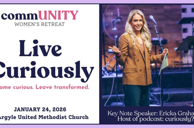 Women of all ages are invited to the commUNITY Women’s Retreat — a day designed to help you rest, reconnect, and rediscover the wonder of faith and friendship. Hosted by four churches coming together as one community, this retreat centers on our 2026 theme, Live Curiously. Come curious. Leave transformed. Expect laughter, worship, meaningful conversations, and time to simply be — together. Childcare will be provided so every woman can fully participate.