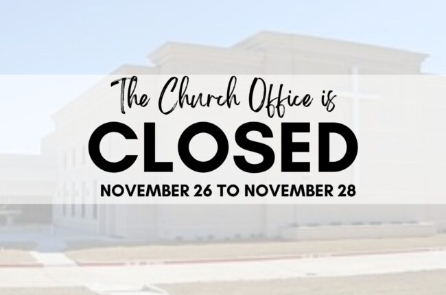 The church office will be closed November 26–28 for Thanksgiving Break. We’re grateful for our church family and wish everyone a joyful and restful holiday weekend!