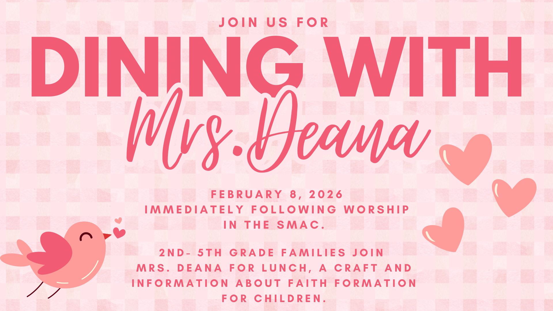 Children in 4th and 5th grade and their families are invited to join us for Dining with Deana! We’ll share a meal together, enjoy a fun craft, and spend time talking about faith formation for children in a relaxed, welcoming setting.