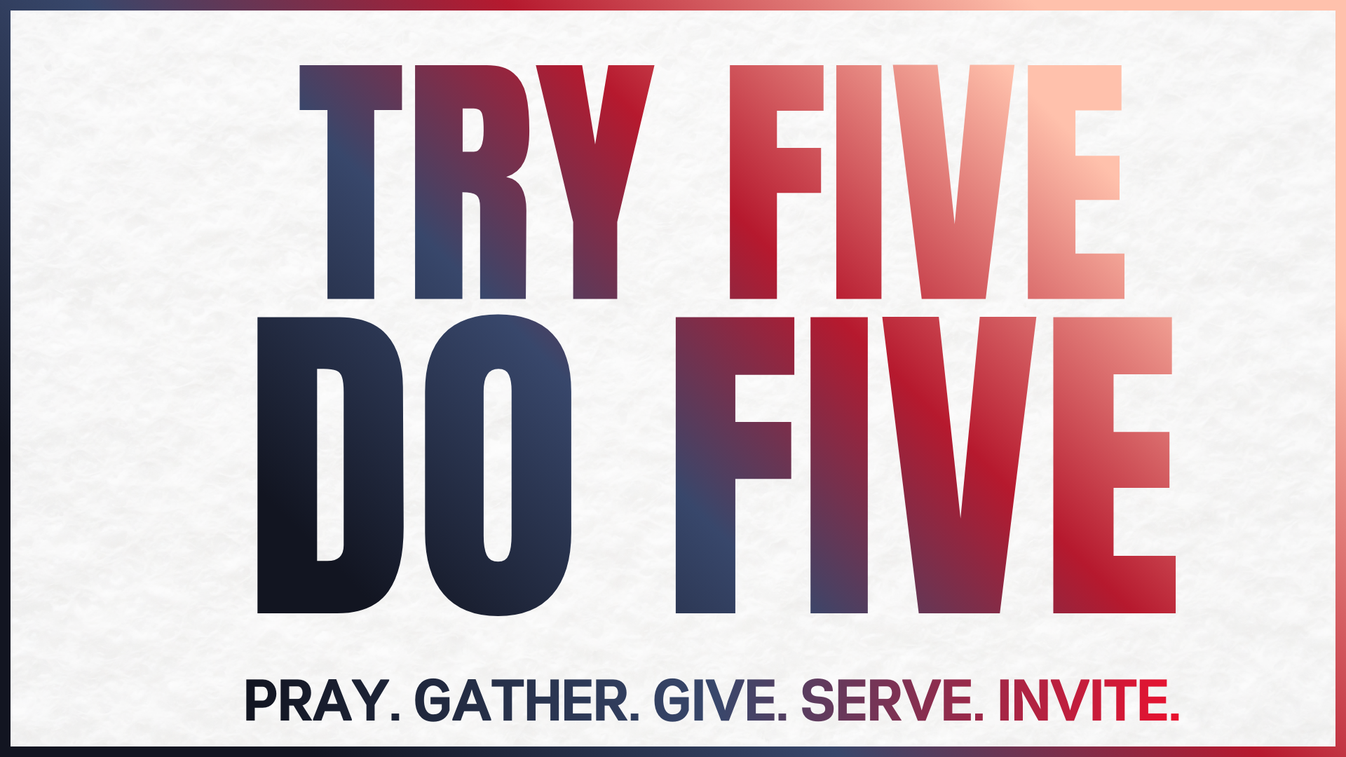 This Sunday, we return to our Try Five, Do Five commitment—what it looks like to be all in as a church. We’ll be stepping back into those rhythms together—Pray, Gather, Give, Serve, and Invite—as part of the way we live out our faith as a community.