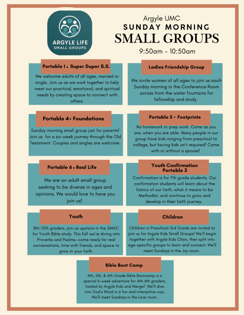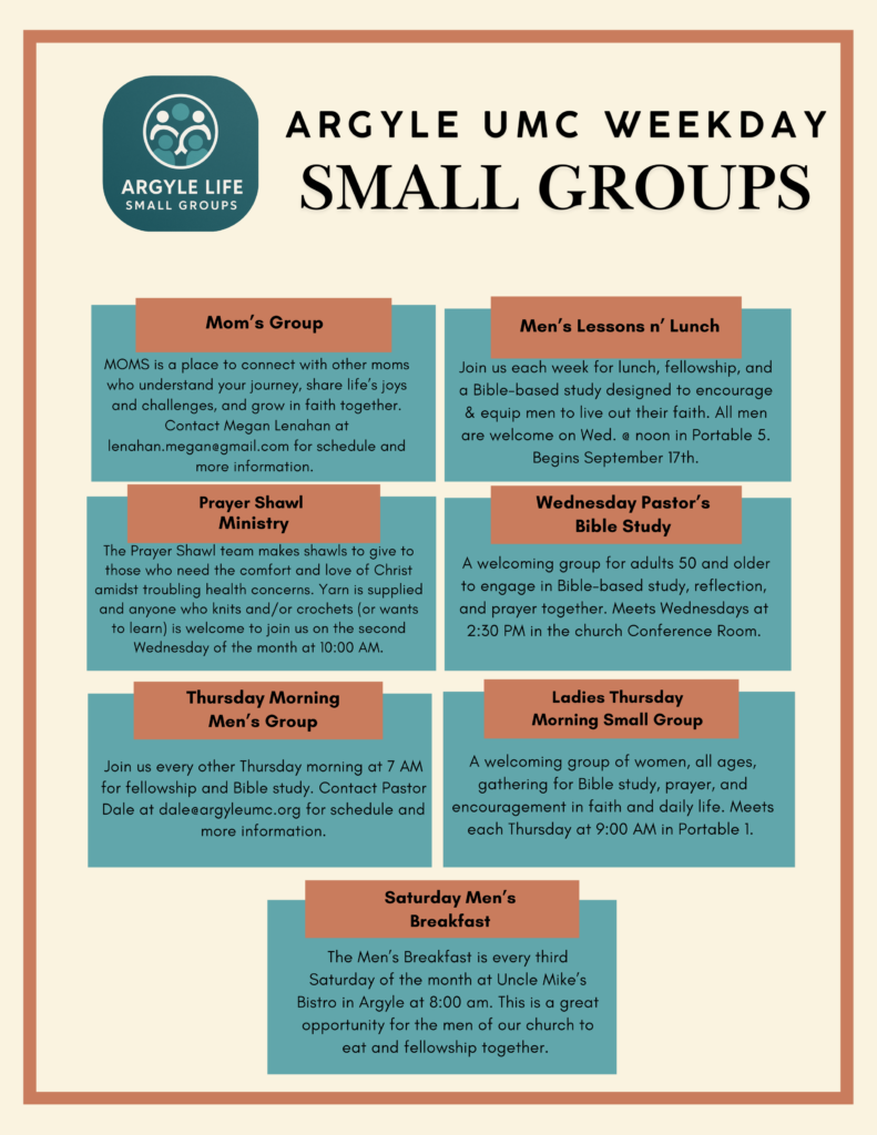Small Groups at Argyle United Methodist Church is a place to connect and grow. Our Small Groups are designed to bring together people of all ages and life stages to build meaningful relationships, deepen their faith, and explore the Bible in a warm and supportive environment. Whether you are new to the church, looking for fellowship, or wanting to grow in your faith, there’s a Small Group for you!