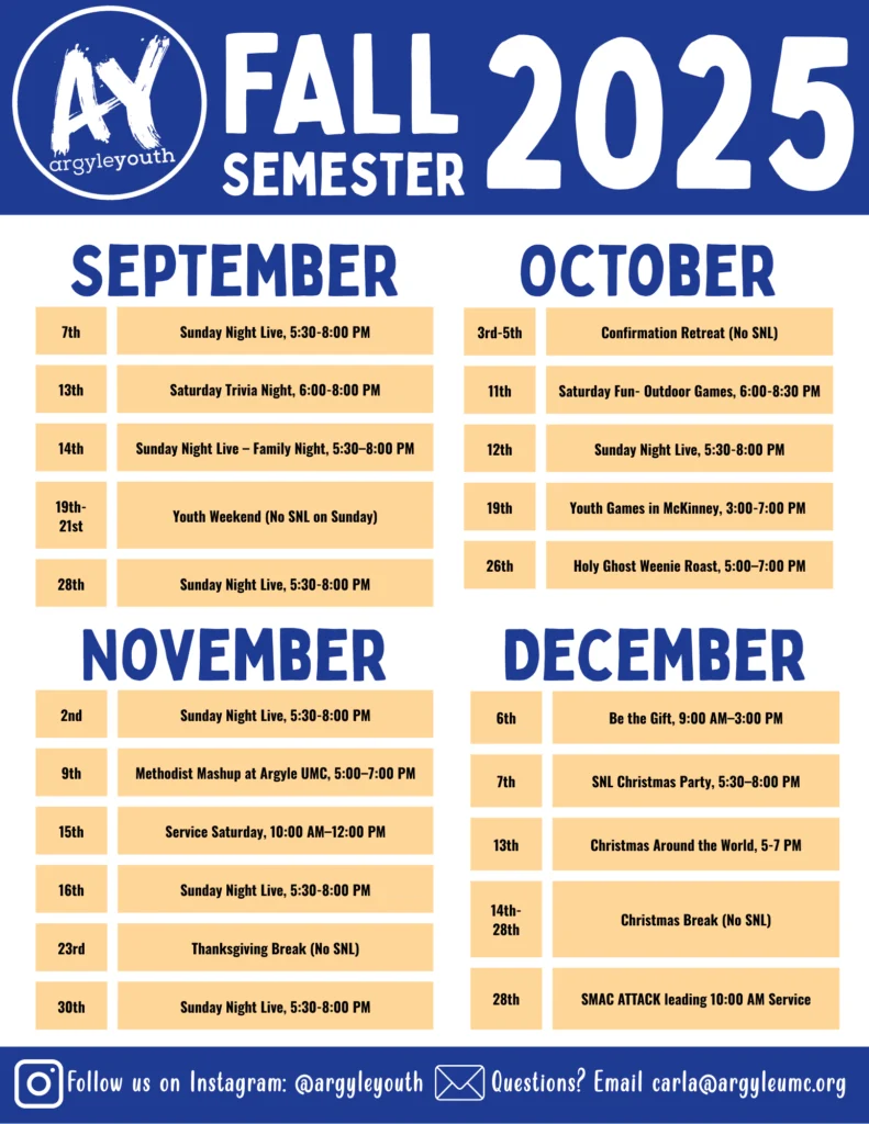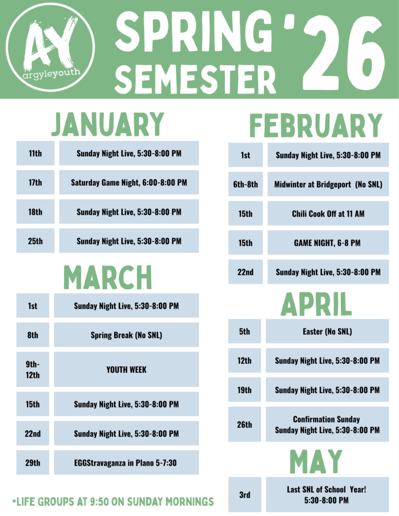 Argyle Youth is the student ministry of Argyle United Methodist Church, serving 6th–12th graders. Our mission is to equip students to live as disciples of Jesus in their everyday lives. We provide a safe and welcoming space where students can come exactly as they are and know that they are seen, known, and deeply loved.